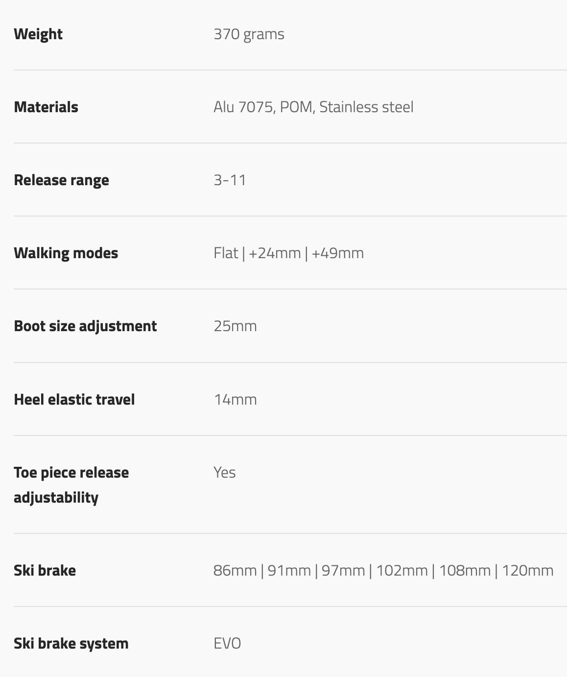 Aluminum Snowpack Proof System: this prevents snow and ice debris from accumulating under the mobile parts of the toe piece.