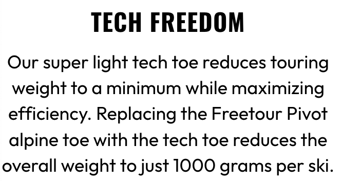 The Tech toe is not designed for the use in downhill skiing. It can be used for small descents with skins on.Weight (Alpine and Touring): 1340g and 1000g