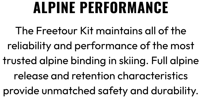 The Freetour is a zero compromise solution to alpine touring bindings. An extremely simple interchange combines the Look Pivot, the most trusted and reliable alpine binding, with the super-light efficiency of our pin-tech touring toe. It is hands down the best hybrid touring binding on the market. The solution for freeride, realized.