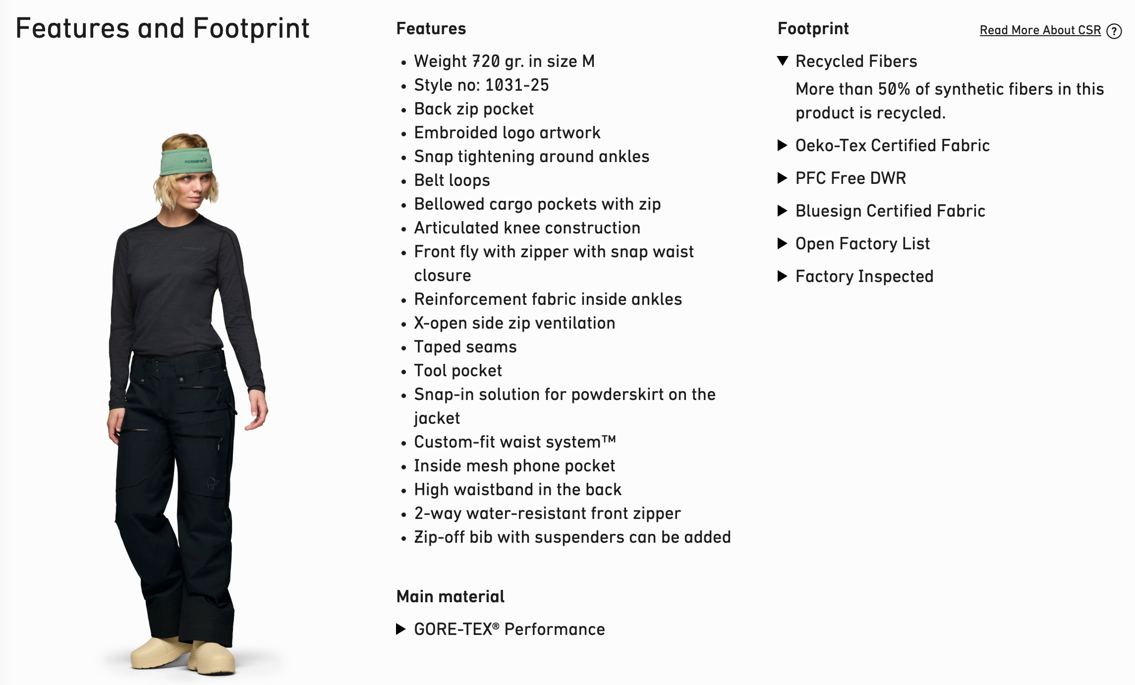 The fabric is a 2-layer woven ePE GORE-TEX® fabric with a 100% 150D recycled polyester face,176gm2. The PrimaLoft Silver insulation is a 100% recycled polyester.